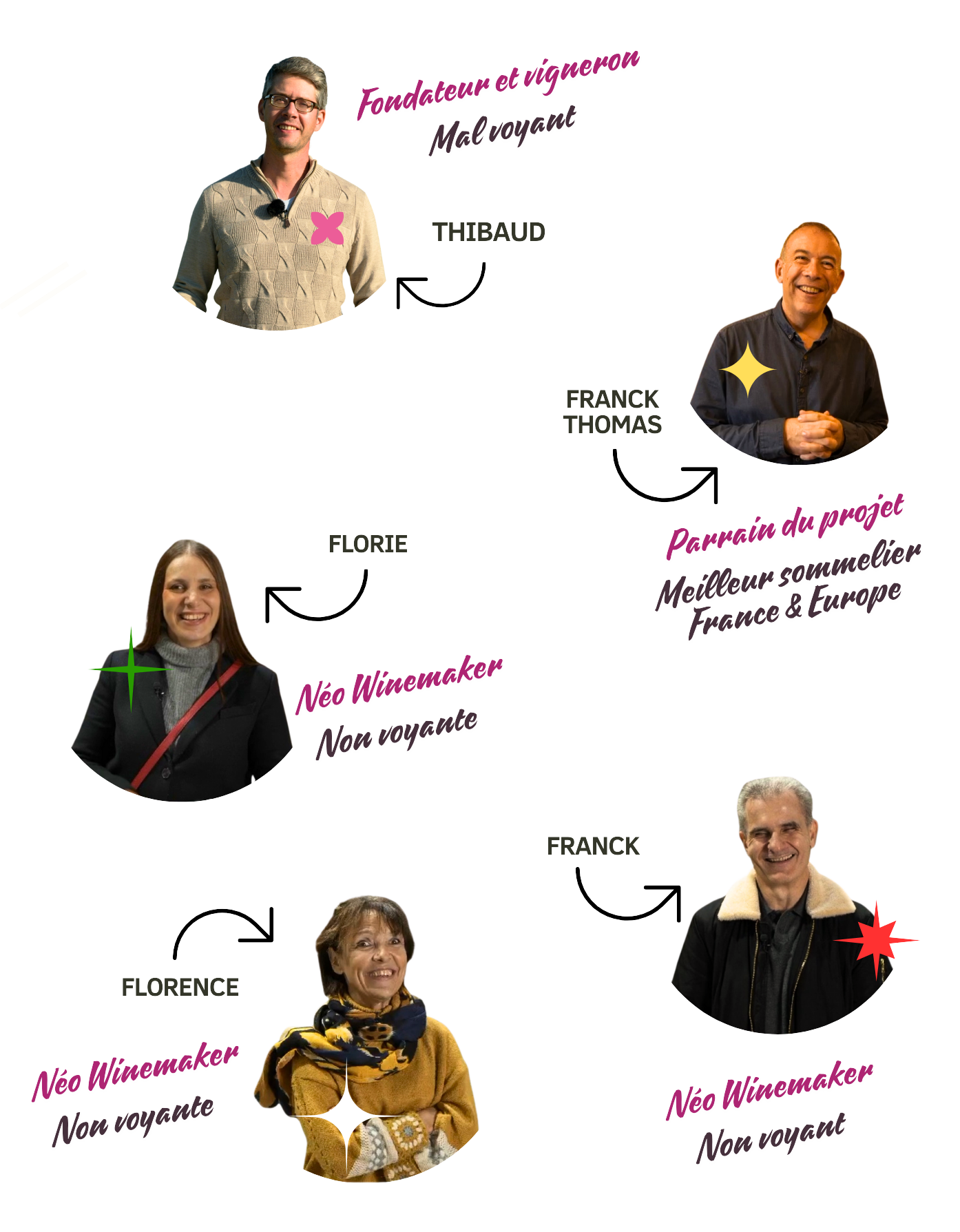 Derrière ce projet se trouve une équipe de vignerons non-voyants et malvoyants, animés par la volonté de bousculer les codes de la viticulture traditionnelle. Leur approche sensorielle et leur expertise donnent naissance à des vins biologiques de haute qualité, témoignant de leur résilience et de leur passion.